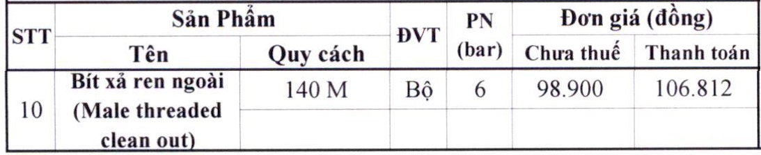 Bảng giá Bít Xả Ren Ngoài Bình Minh