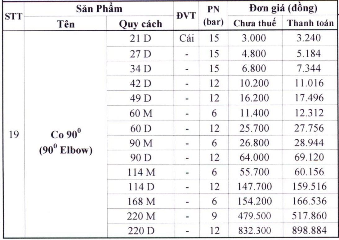 Bảng giá Co 90 Nhựa uPVC Bình Minh