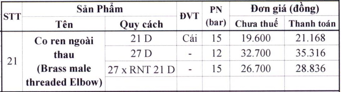 Co Ren Ngoài Thau (Cút ren ngoài thau) là một loại phụ kiện ống nhựa được thiết kế để kết nối các đoạn ống với hệ thống đường ống có ren ngoài. Sản phẩm này thường được sử dụng trong các ứng dụng như hệ thống cấp nước, thoát nước, và tưới tiêu.