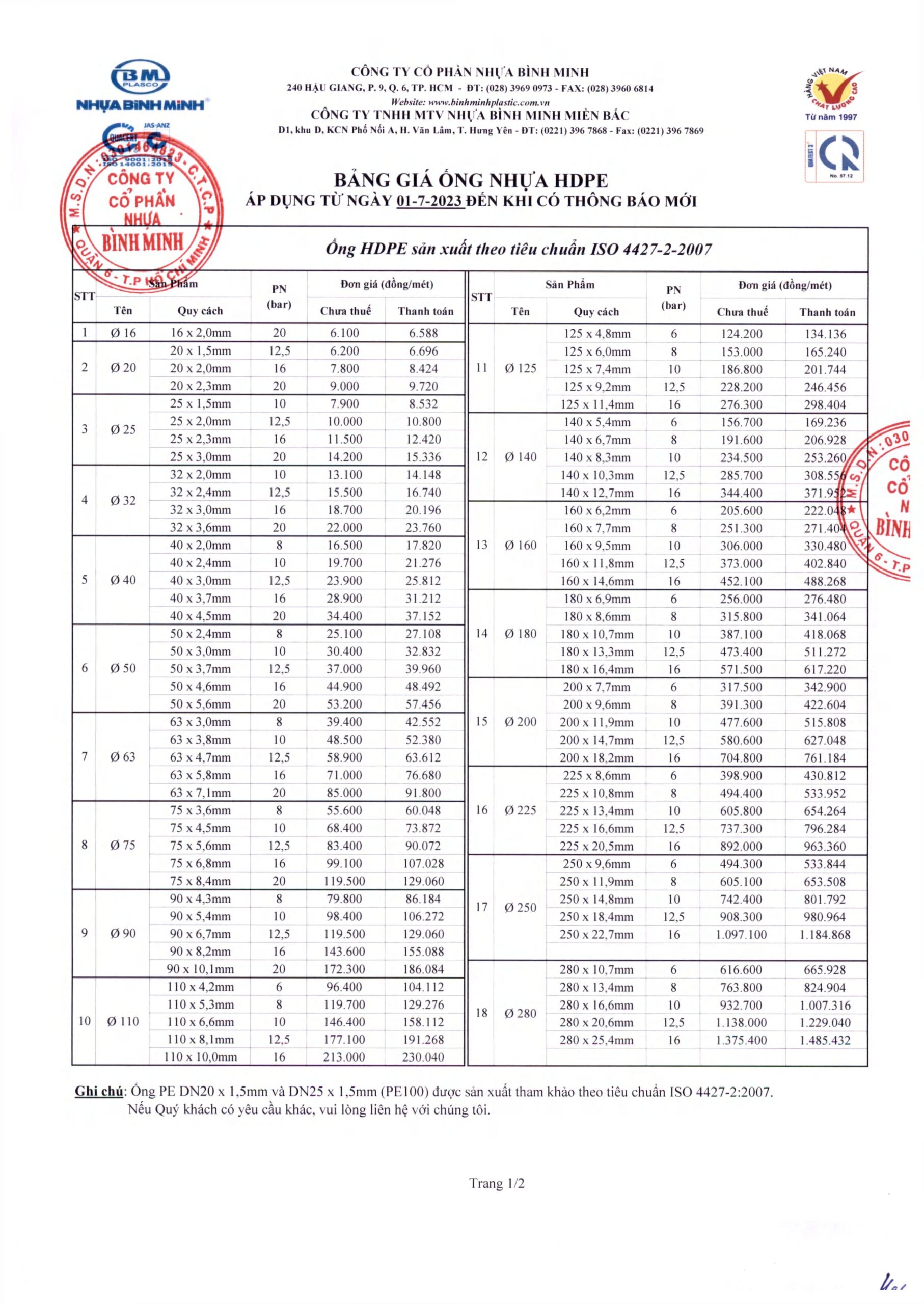 Bảng Giá Kích Thước Ống Nhựa HDPE Bình Minh